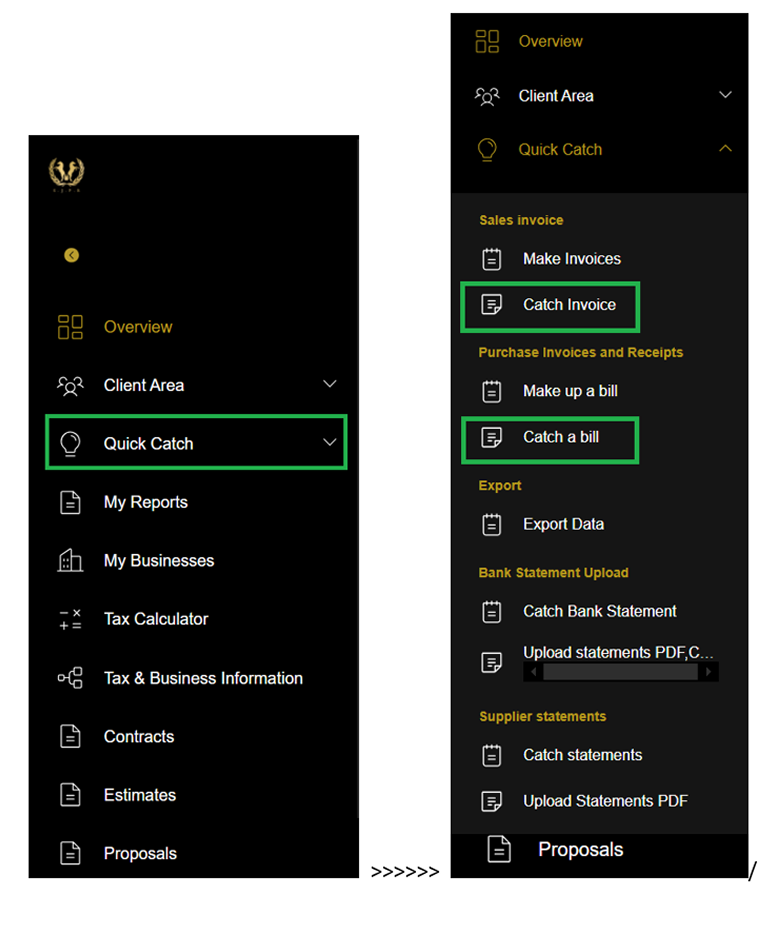 Currently, the only available features on the side menu are found under Quick Catch. These include the Catch Invoice and Catch a Bill functionalities, as well as access to Accounts for managing user settings.